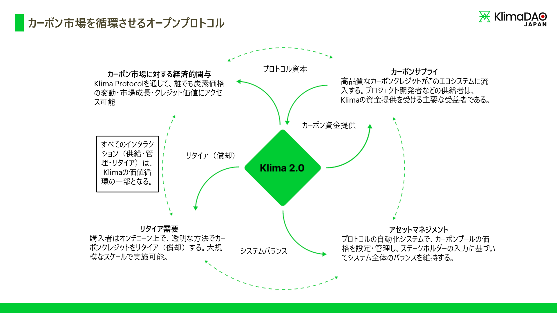この図は、Klima Protocolがどのように市場全体を循環させているかを示しています。
